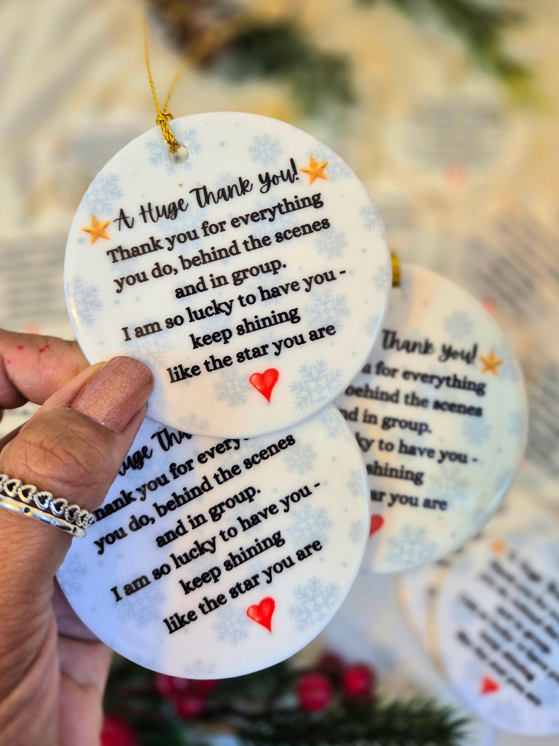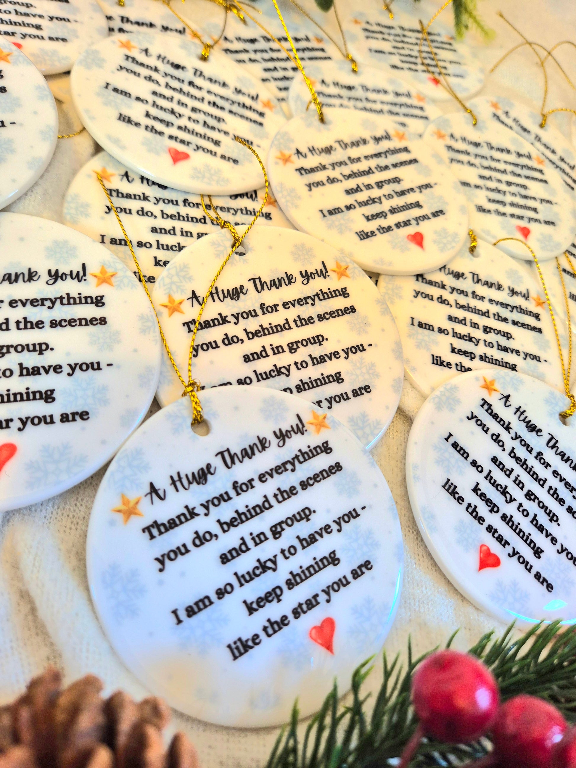 Show your team how much they mean to you with our Group Thank You Bauble. Made of ceramic, this bauble features a beautiful Snowflake design and a heartfelt "Thank you" message. A perfect keepsake to express your gratitude and appreciation for their hard work and dedication.