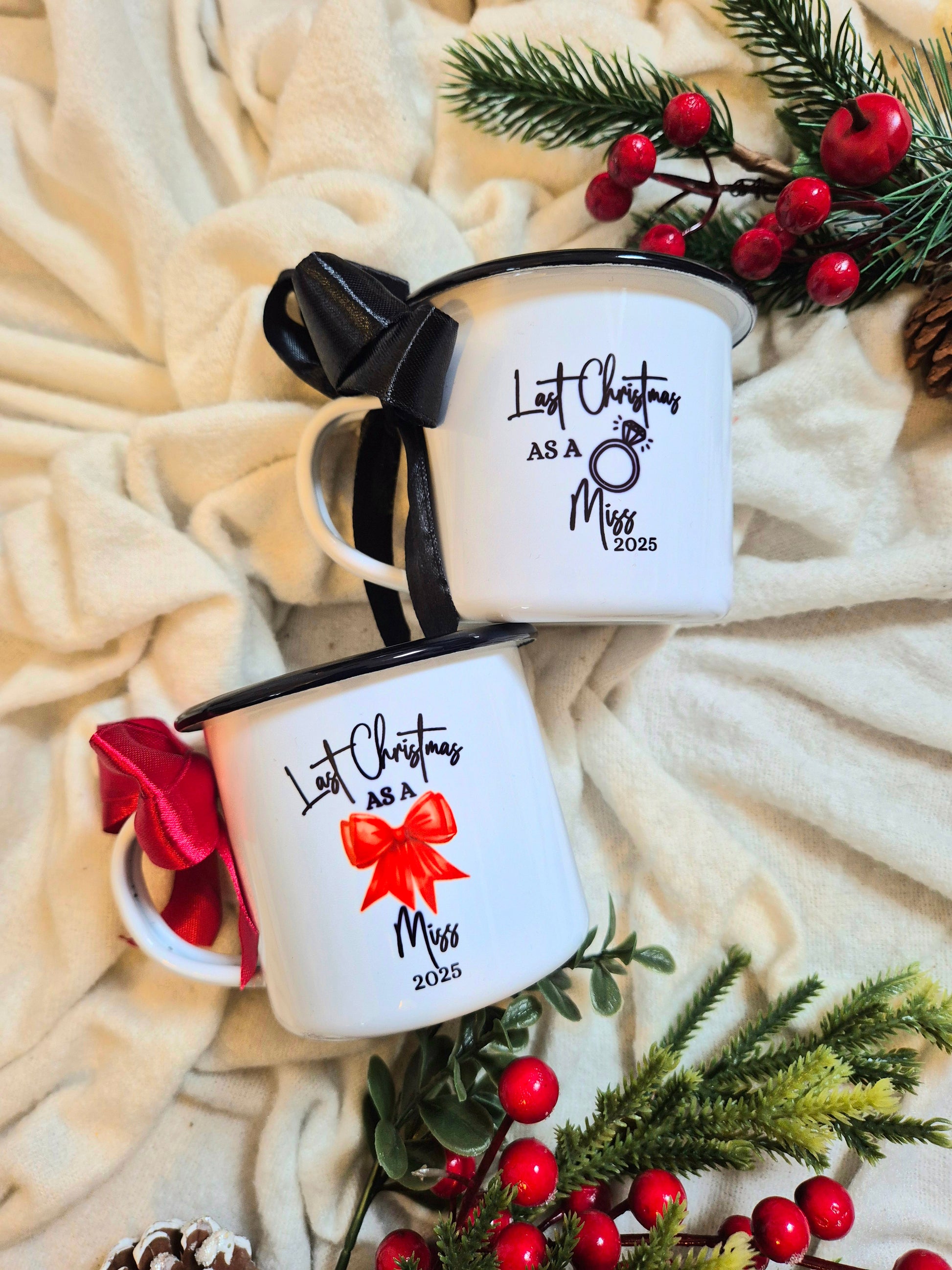 Last Christmas as a Miss Mug, Enamel Festive Hot Chocolate Cup