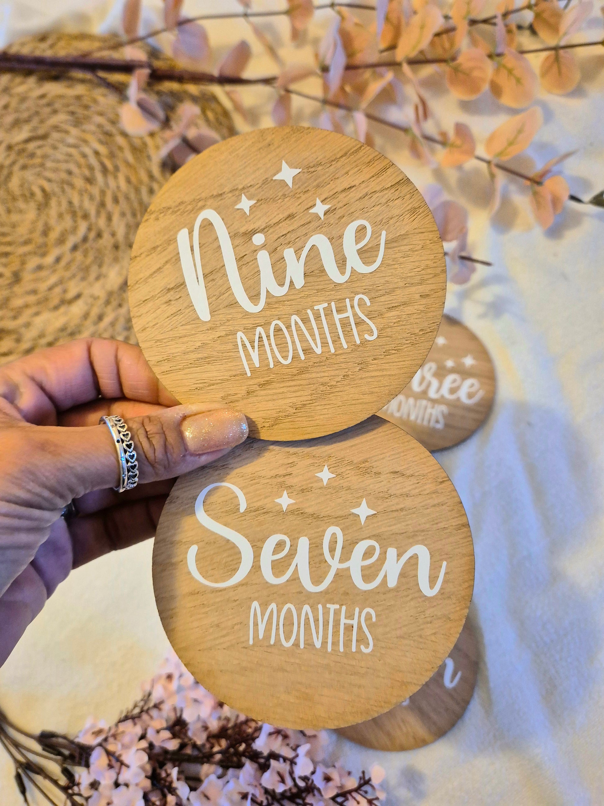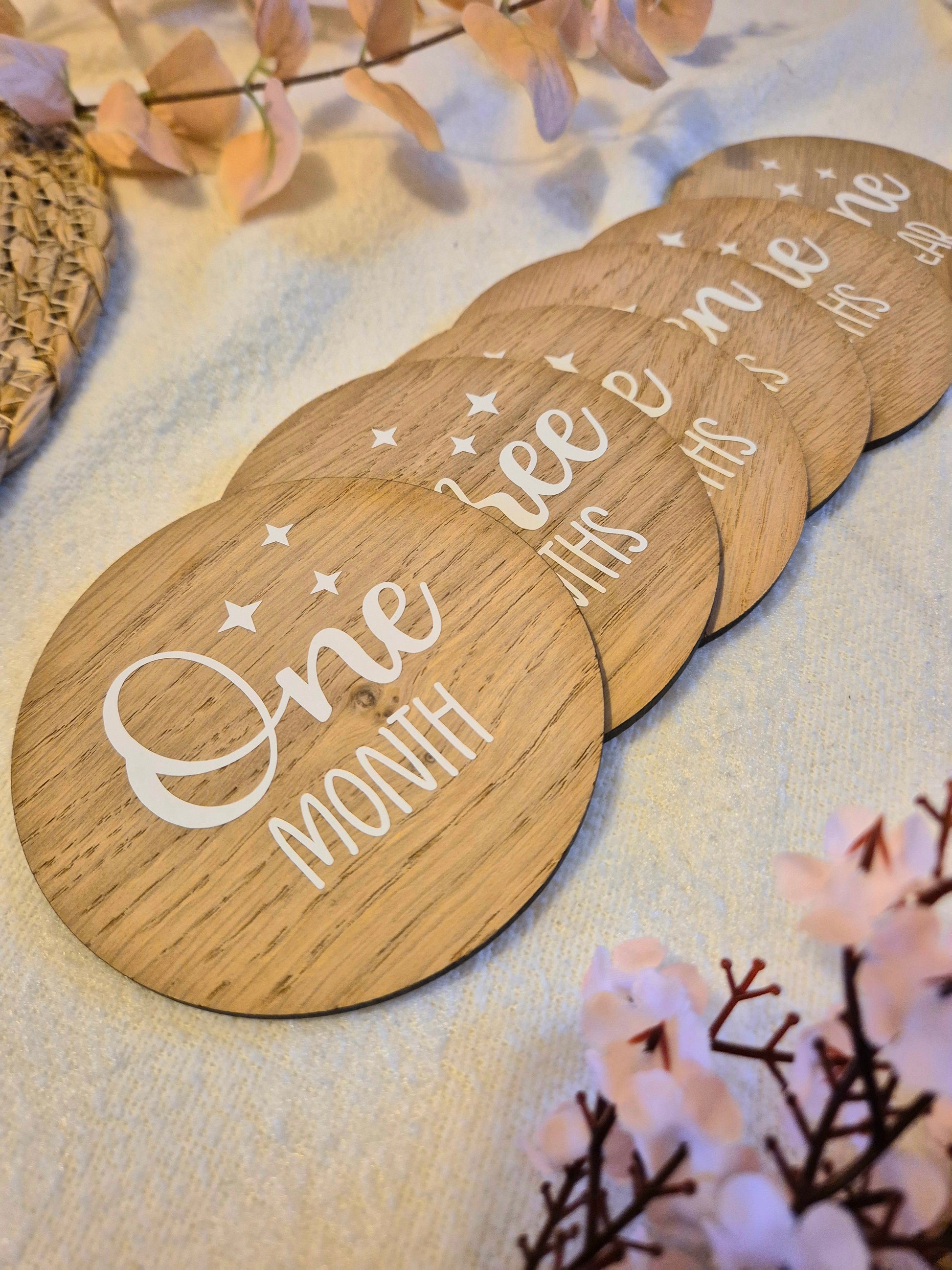 Capture every precious moment with our Oak Baby Milestone Discs! These double-sided discs are adorned with white writing and stars, showcasing your little one's milestones from one month to one year. Keep them organized in the included organza bag for easy photo opportunities. Cherish every moment with these perfect keepsakes.