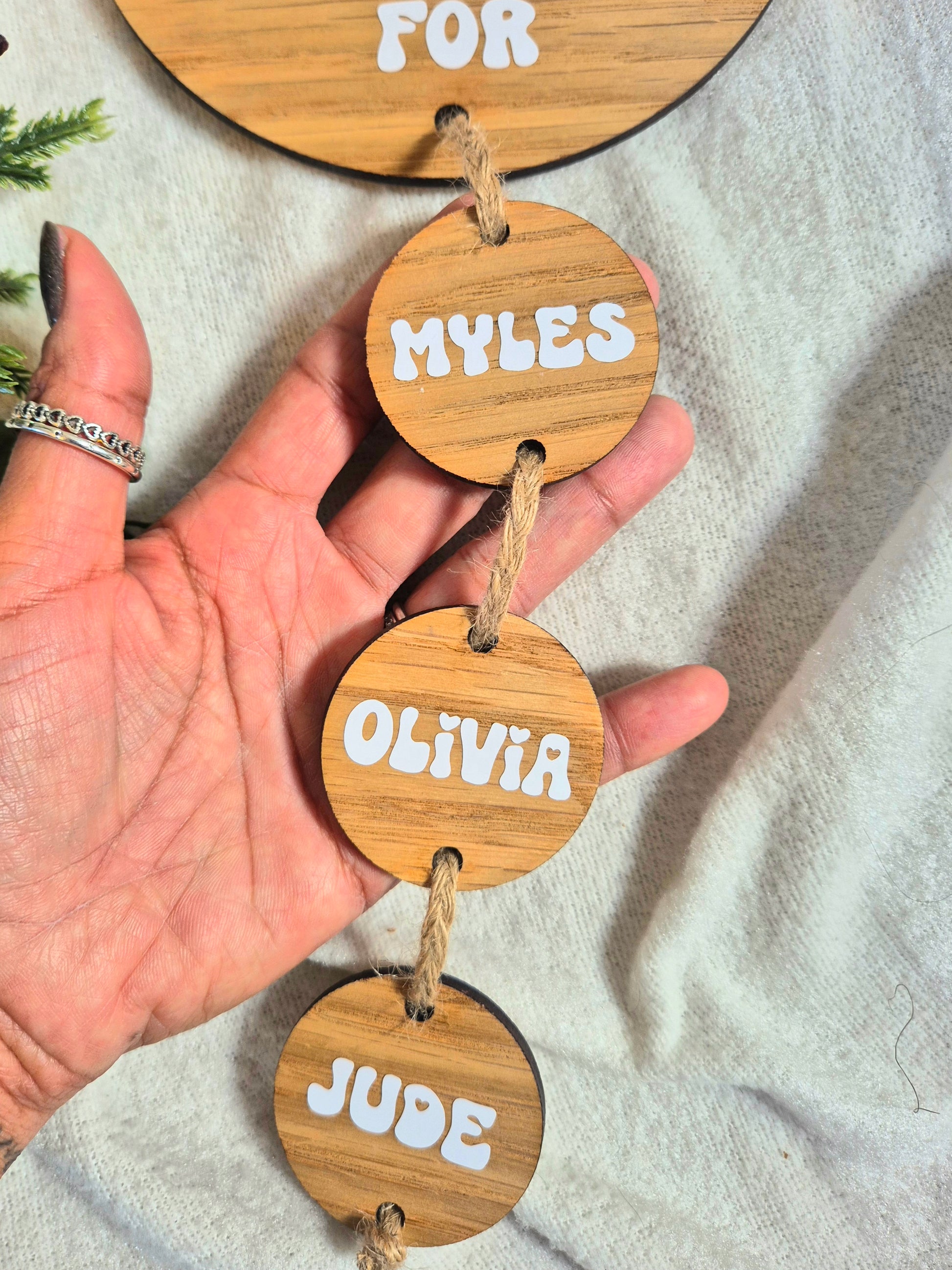 Each name tag is approx 5cm in diameter and you can add as many names as you need. They dangle perfectly below the main sign, all linked up with more twine.