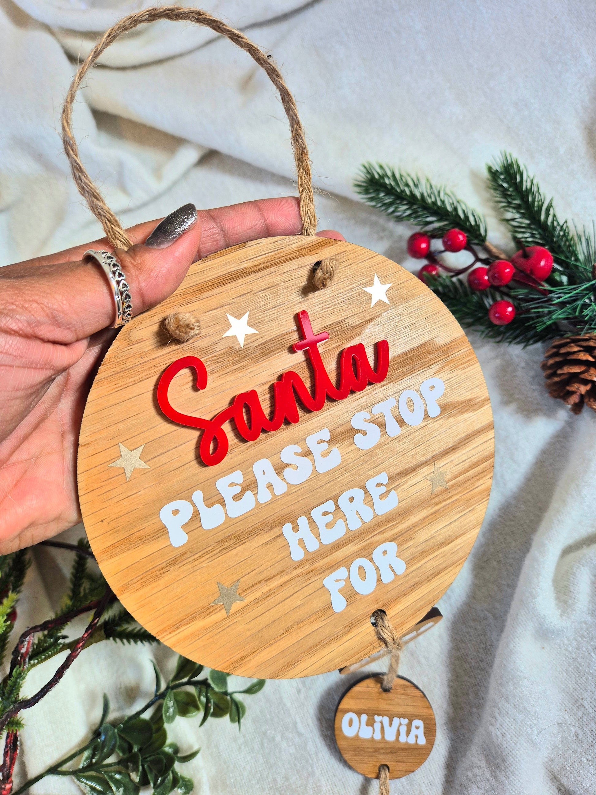 The main circle is approx 15cm in diameter and personalised with white and gold text and stars with the word 'Santa' in a bright red acrylic and finished with twine to hang.