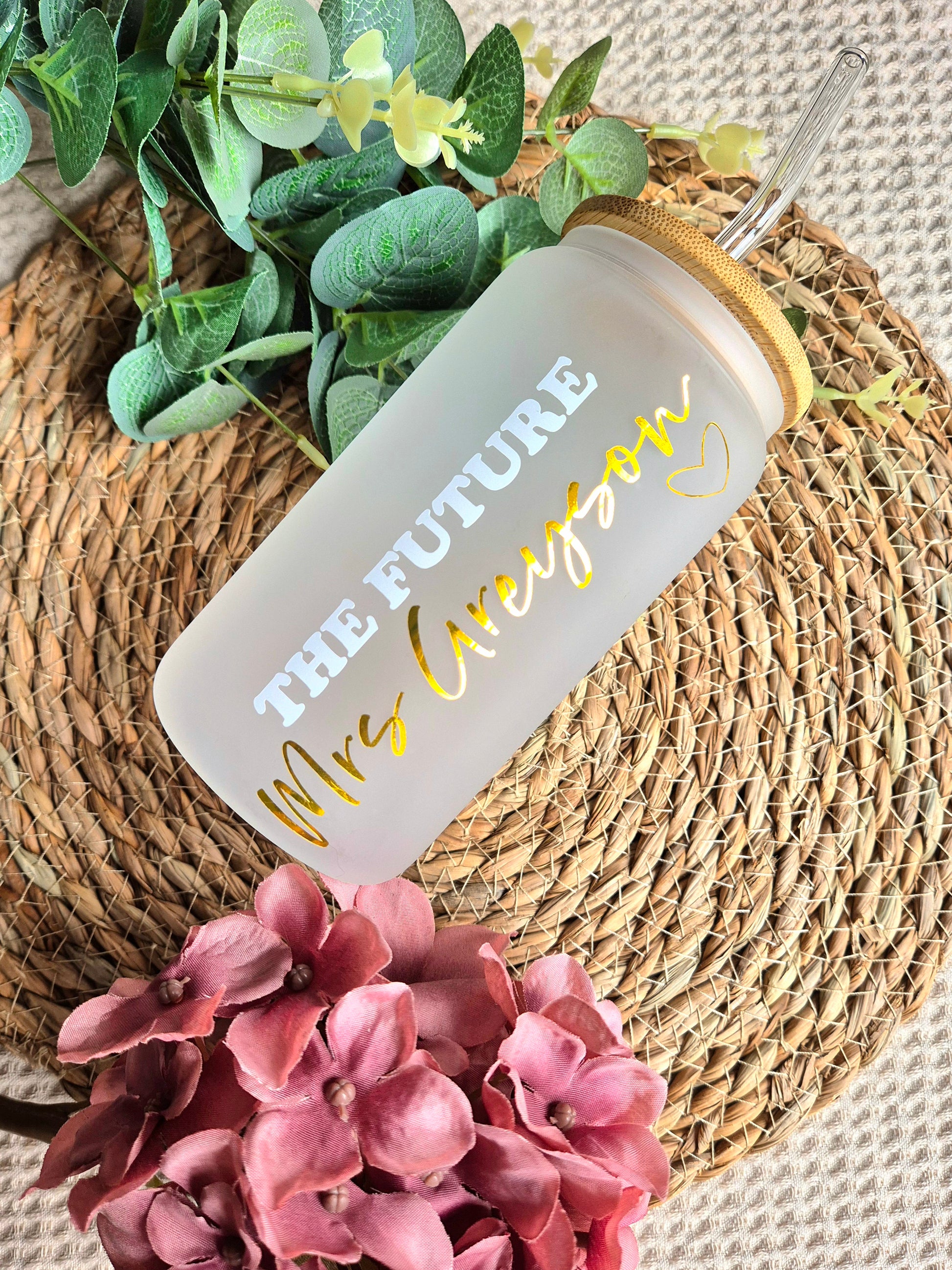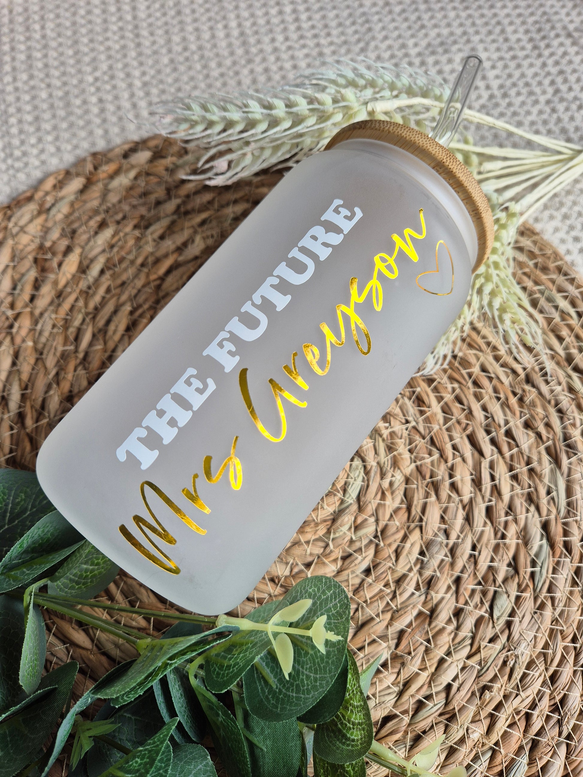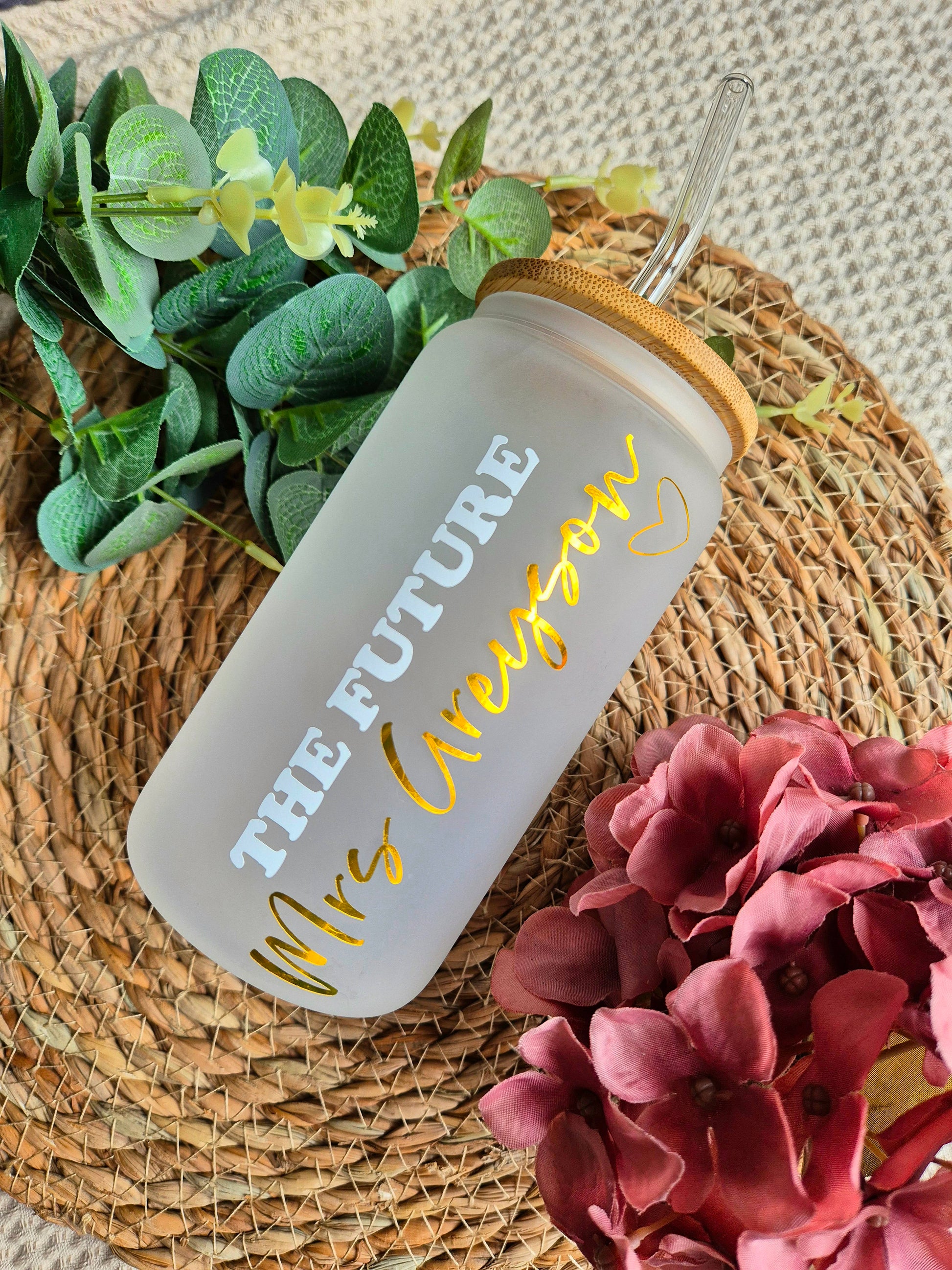 This Frosted Libby Glass features a custom white and glossy gold font, a stylish bamboo lid and straw, and a frosted finish for a unique touch. Personalise it with her new surname for a special keepsake.
