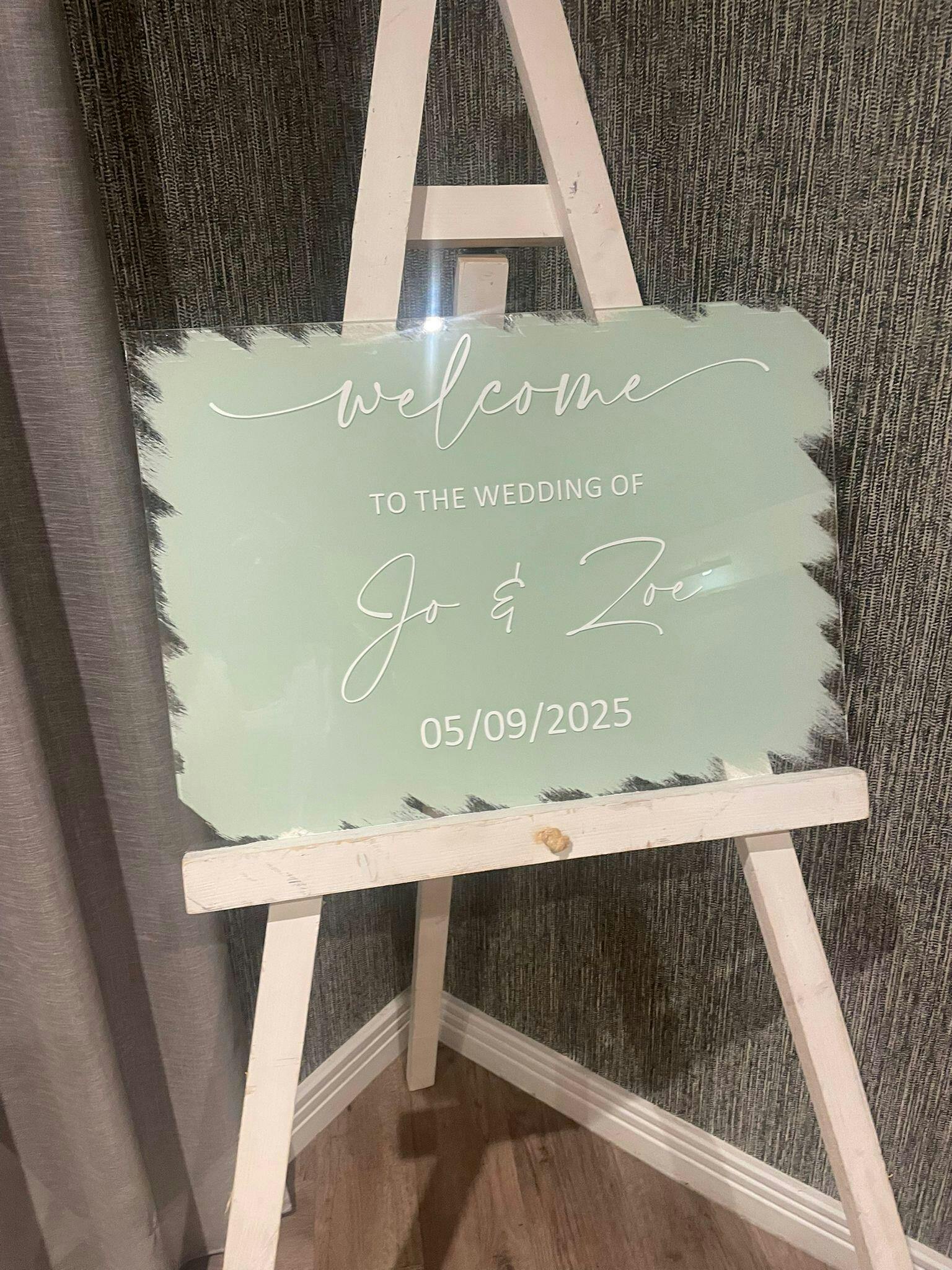 Our welcome signs are A2 in size, made from 5mm acrylic, hand painted with vinyl used for the wording.